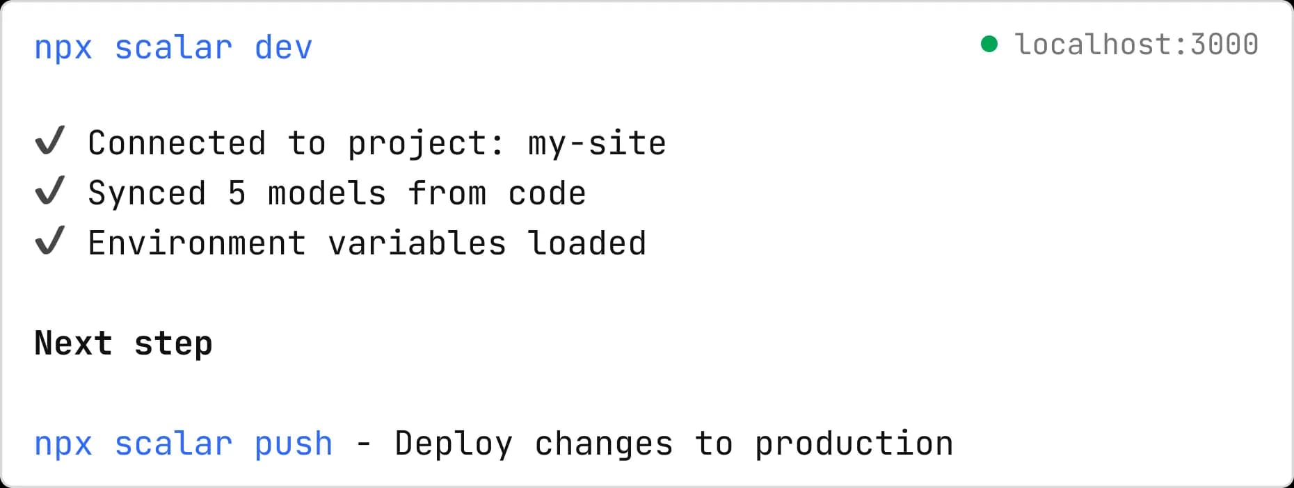 With npx scalar dev, your local environment becomes the control hub. Work offline, iterate rapidly, and push when you're ready.